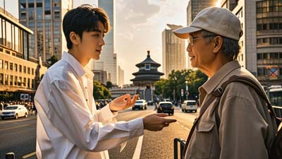 B: 往 前 走,在 十 字 路口 向 右 拐,再 走 5 分钟 就 到 了。
