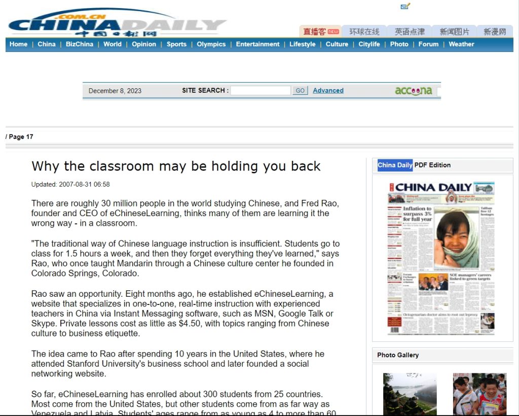 Rao saw an opportunity. Eight months ago, he established eChineseLearning, a website that specializes in one-to-one, real-time instruction with experienced teachers in China via Instant Messaging software, such as MSN, Google Talk or Skype. Private lessons cost as little as $4.50, with topics ranging from Chinese culture to business etiquette.