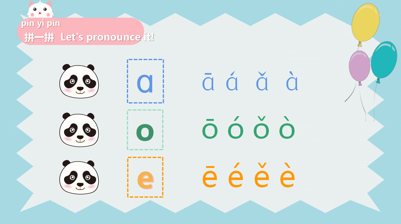 张大嘴巴aaa,圆圆嘴巴ooo,嘴巴扁扁eee ,牙齿对齐iii,嘴巴小圆uuu,小鱼吹哨üüü。”